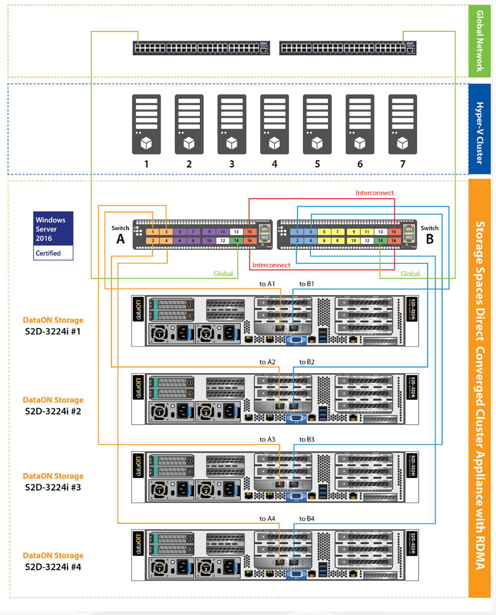 SOS purchased four DataON S2D-3224i hyper-converged cluster appliances (HCCAs) for Youth Villages’ data center. Optimized for balanced IOPS and capacity, this all-flash NVMe and SATA SSD solution provides maximum flash performance in a 4-node cluster. It has been tested and certified to be part of the Windows Server Software-Defined (WSSD) program, following Microsoft’s requirements and best practices for a Windows Server 2016 software-defined infrastructure. The S2D-3224i is also certified for Windows Server 2016 SDDC and Windows Server 2012 R2.