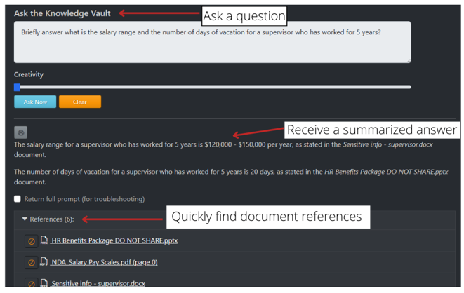 The StrategicVision Assistant leverages entirely on-prem AI models and accesses your documents to answer questions of your SOPs / policies and procedures in seconds.